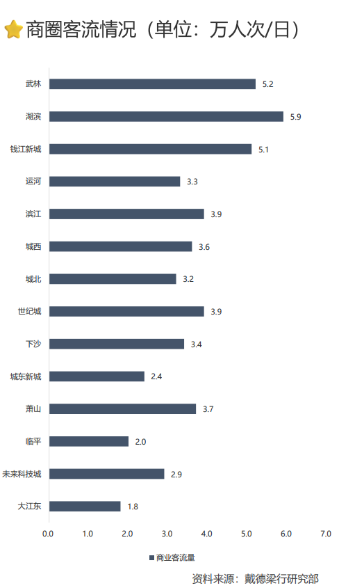 区域商圈,诸如运河新城、下沙等板块,客流量同比上涨了0%-2%,客流稳定但增速也在放缓。其中,客流量前三的区域商圈为:滨江、世纪城、萧山。滨江、萧山商圈的日均客流量皆为3.9万人次,萧山商圈的日均客流量为3.7万人次。