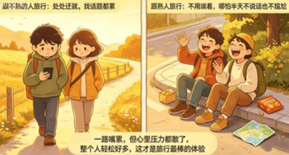 很多人说跟不熟的人旅行要处处迁就,找话题都累,跟熟人旅行就完全不一样,不用端着不用假装,想到什么就说什么,哪怕半天不说话也不会觉得尴尬,这种松弛感真的太舒服了。一路下来嘴确实是累了,但是心里的压力都跟着说出来的话散掉了,整个人都轻松了好多,这才是旅行最棒的体验。