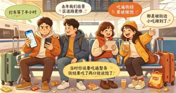 逛景点的时候看到奇怪的树要聊两句,吃到好吃的小吃要聊两句,哪怕是走累了坐在路边休息,也能对着过往的行人唠半天,从学生时代的趣事聊到最近追的剧,从下次旅行要去哪里聊到小时候偷偷干的傻事,话好像怎么说都说不完。等到了晚上回酒店,一群人凑在一个房间里,还能接着唠到半夜,明明嗓子都哑了,还是停不下来。