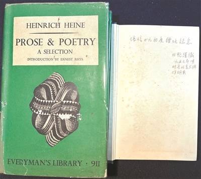 《海涅诗文选》(Prose&Poetry:ASelection)的前衬页上方钢笔题写:“给培信:廿九岁生日记念。世点,一九五七.二.北京。”