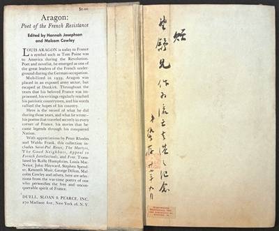 在施蛰存先生送给我的外文旧书中,有一本《Aragon:PoetoftheFrenchResistance》(《阿拉贡:法国抵抗诗人》),HannahJosephson和MalcolmCowley编,纽约Duell,SloanandPearce一九四五年初版二刷。路易·阿拉贡是法国超现实主义诗人,二战期间成为沦陷法国的地下抵抗运动领袖。书的前衬页的左侧,有施先生毛笔题词:“赠望舒兄:作为流亡去港之纪念。弟蛰存,卅七年九月。”