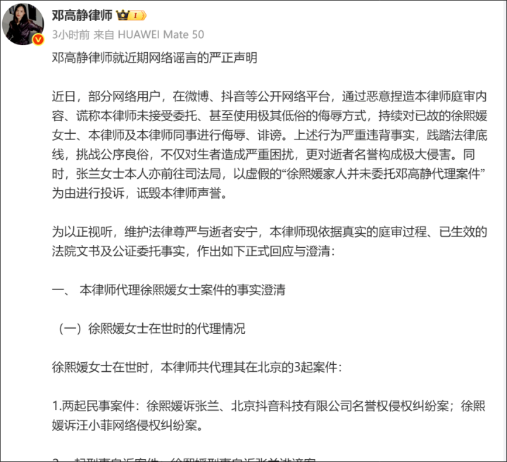 1.关于徐熙媛诉张兰、抖音名誉权侵权案:徐熙媛女士去世后,本律师于2025年4月正式接受其丈夫具俊晔先生、母亲黄春梅女士的委托,继续代理该案。相关委托手续均经公证认证,并已提交至北京互联网法院。此“继续代理”为不争事实。